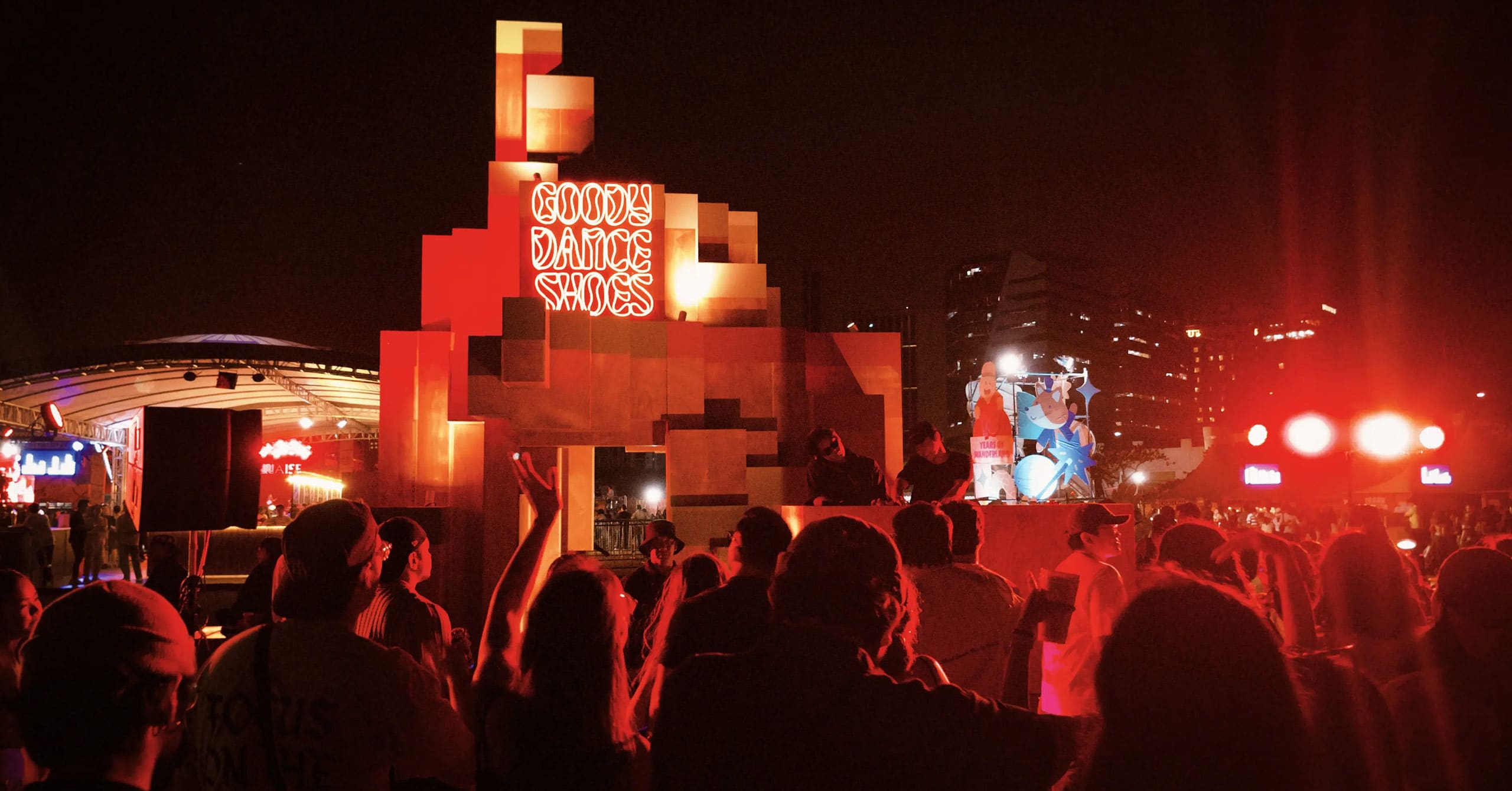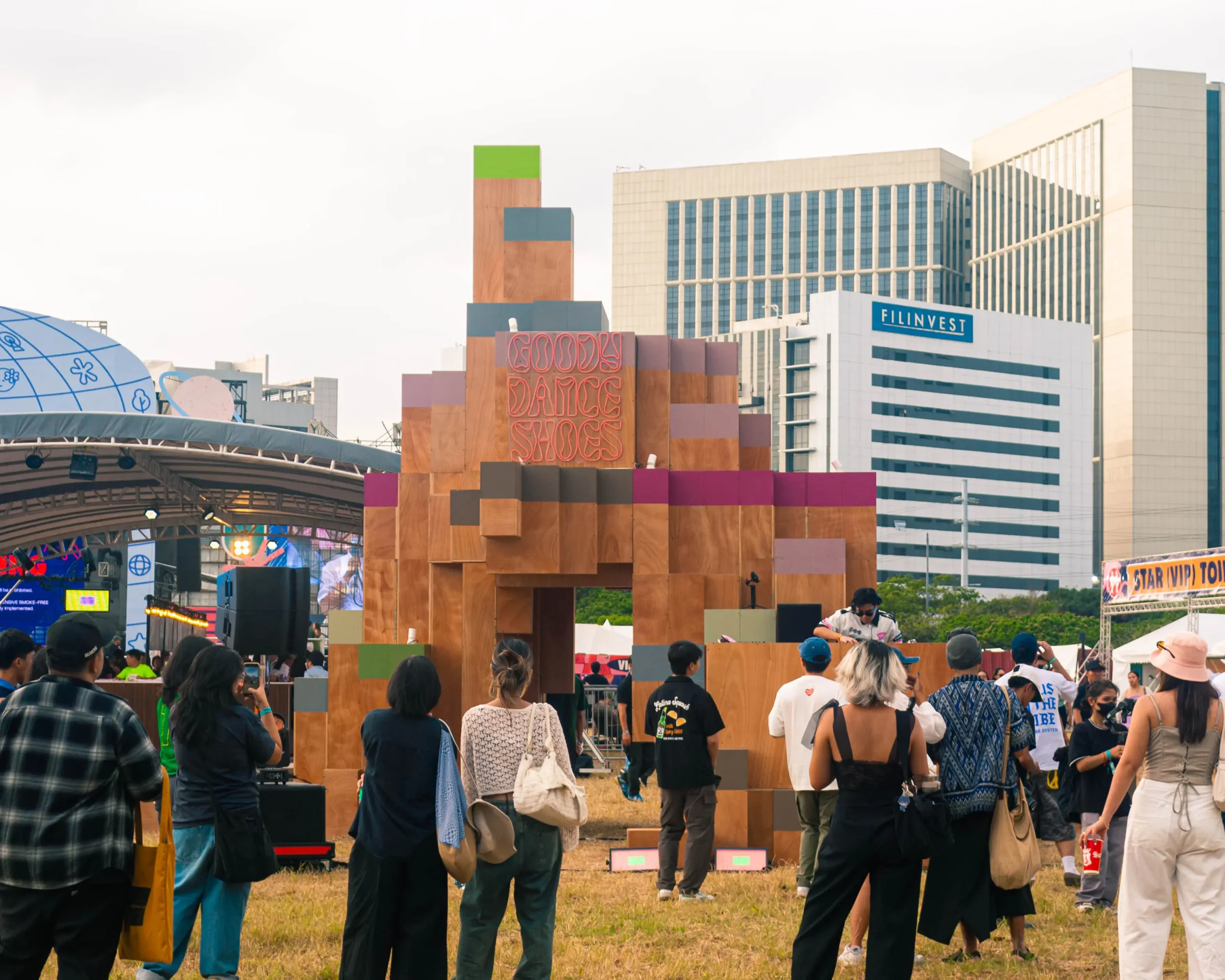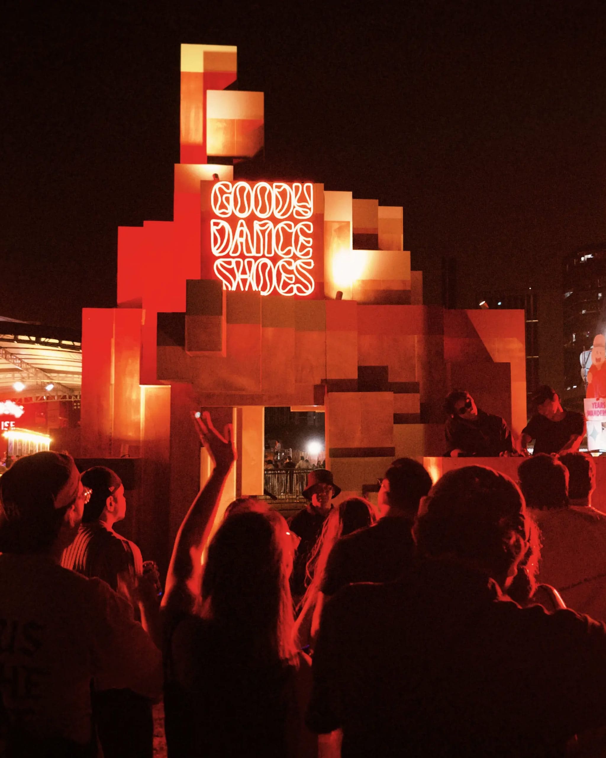 Translating this concept into physical form, the installation was crafted using modular plywood “pixels,” each distinct yet inherently connected. These elements emerge from the ground, forming benches and nooks before expanding into walls and a striking spire. At its heart, a tunnel-like passage draws festival-goers into a communal space—the Goody Dance Shoes Stage—where movement, music, and social interaction seamlessly converge.