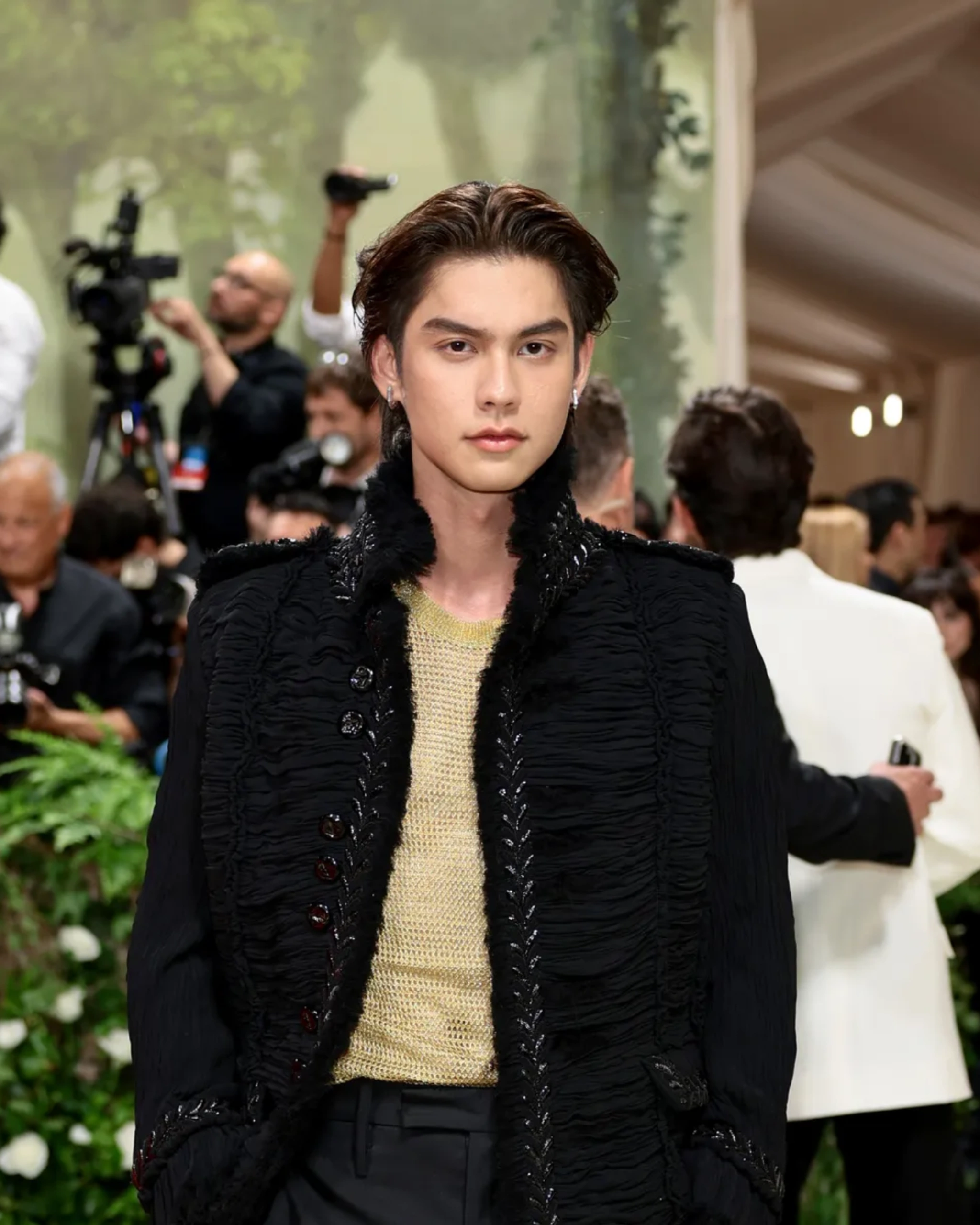 In 2024, Bright walked the carpet as the first Thai star to do so, wearing Burberry with a sharp modernity that refracted the old codes of the suit into something kinetic. A pleated georgette jacket embroidered with bullion florals, a gold mesh tank shimmering beneath—it was elegance remixed, power refracted through gentleness.