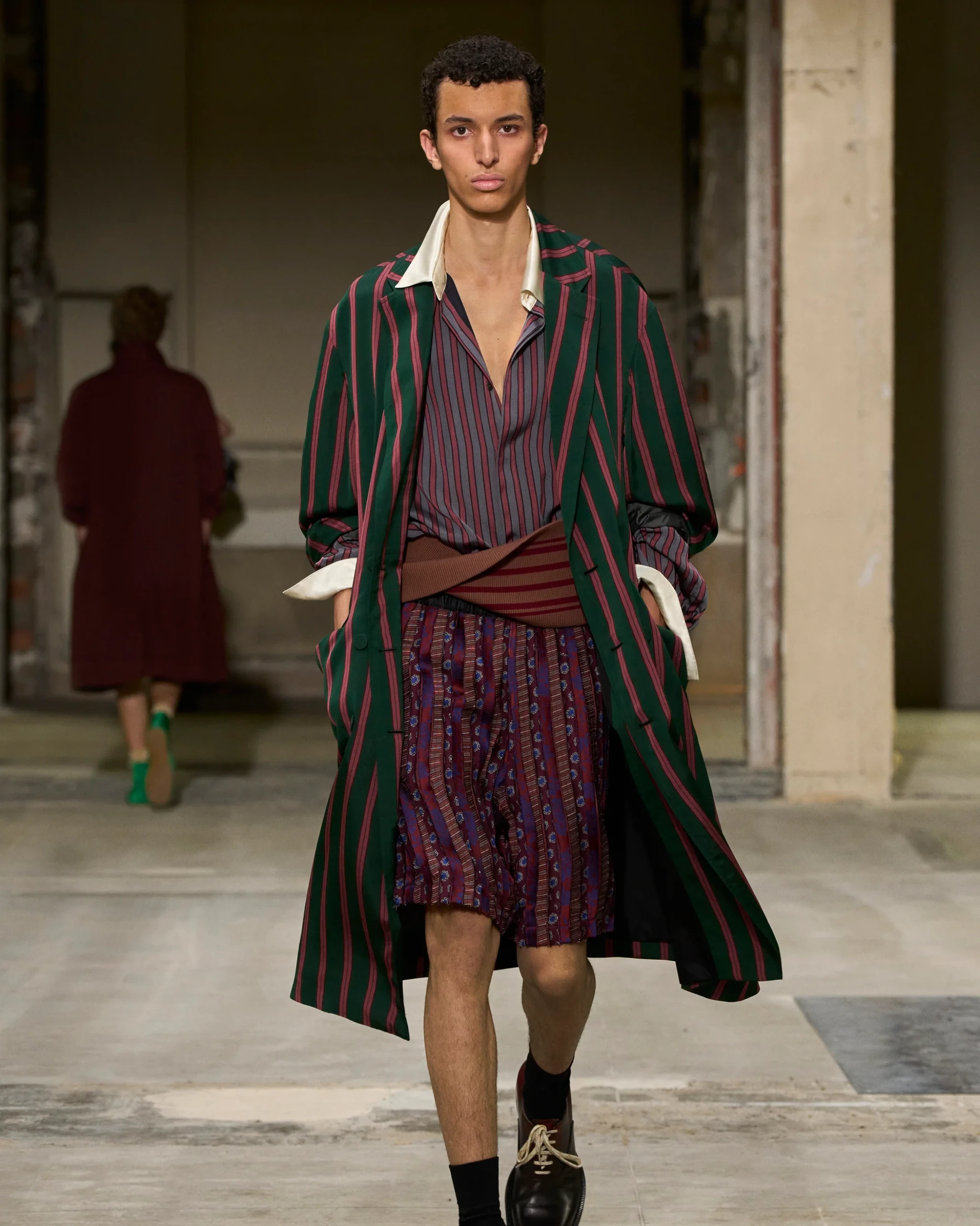 At Dries Van Noten, the sarong emerged as a central menswear statement. Under new menswear creative director Julian Klausner, the show explored both fluidity and formality, with intricate embroidered detailing and fabric wrapping techniques that gestured toward the subcontinent’s enduring tailoring codes.