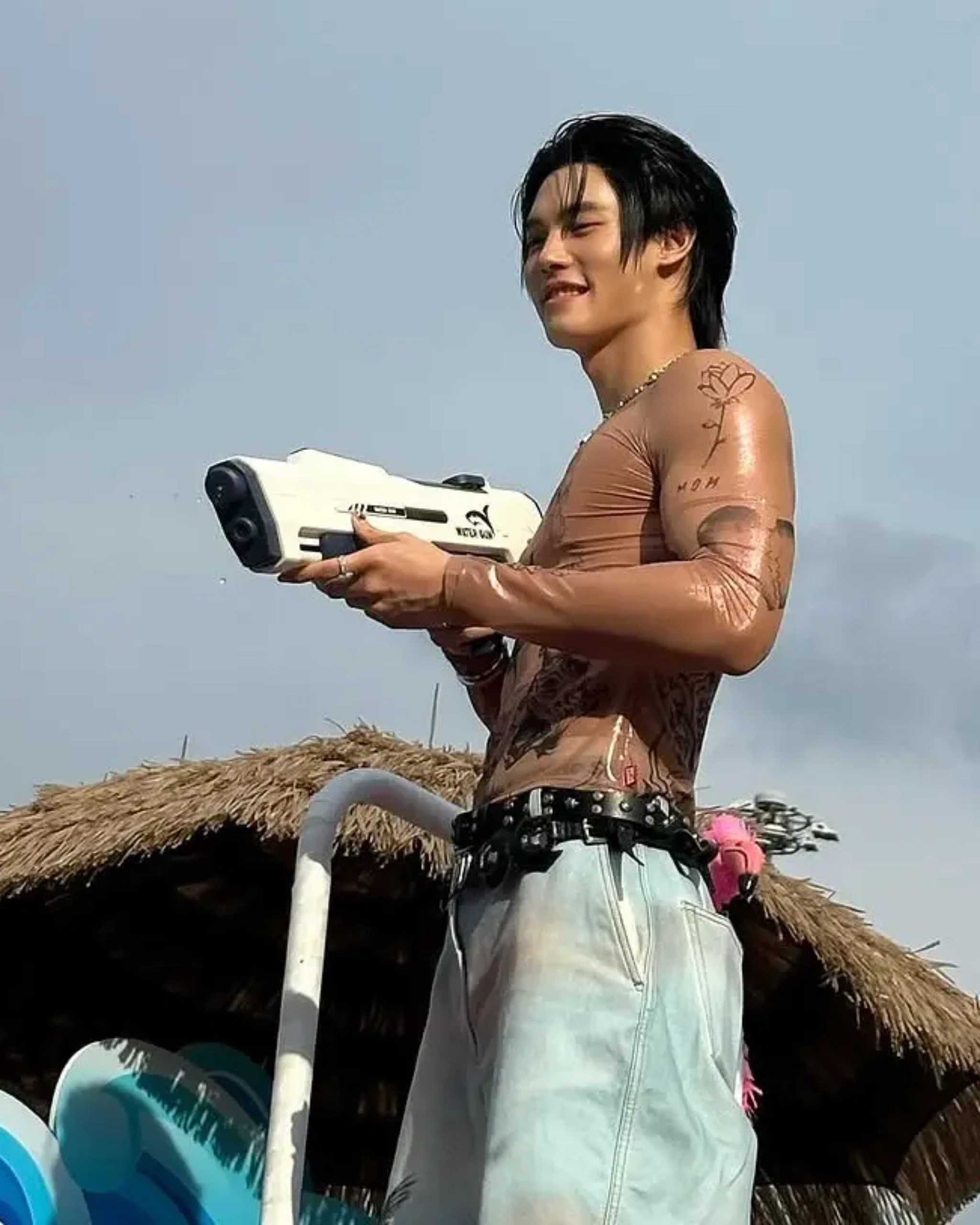 A top that clings like second skin is already a striking look in itself, but that didn’t stop Win from spicing it up even more: denim pants with a palm tree print, two statement belts and silver bling, and a practical North Face x Supreme vest in a camouflage, almost-psychedelic print. Now that’s being stylishly prepared to get wet and wild.