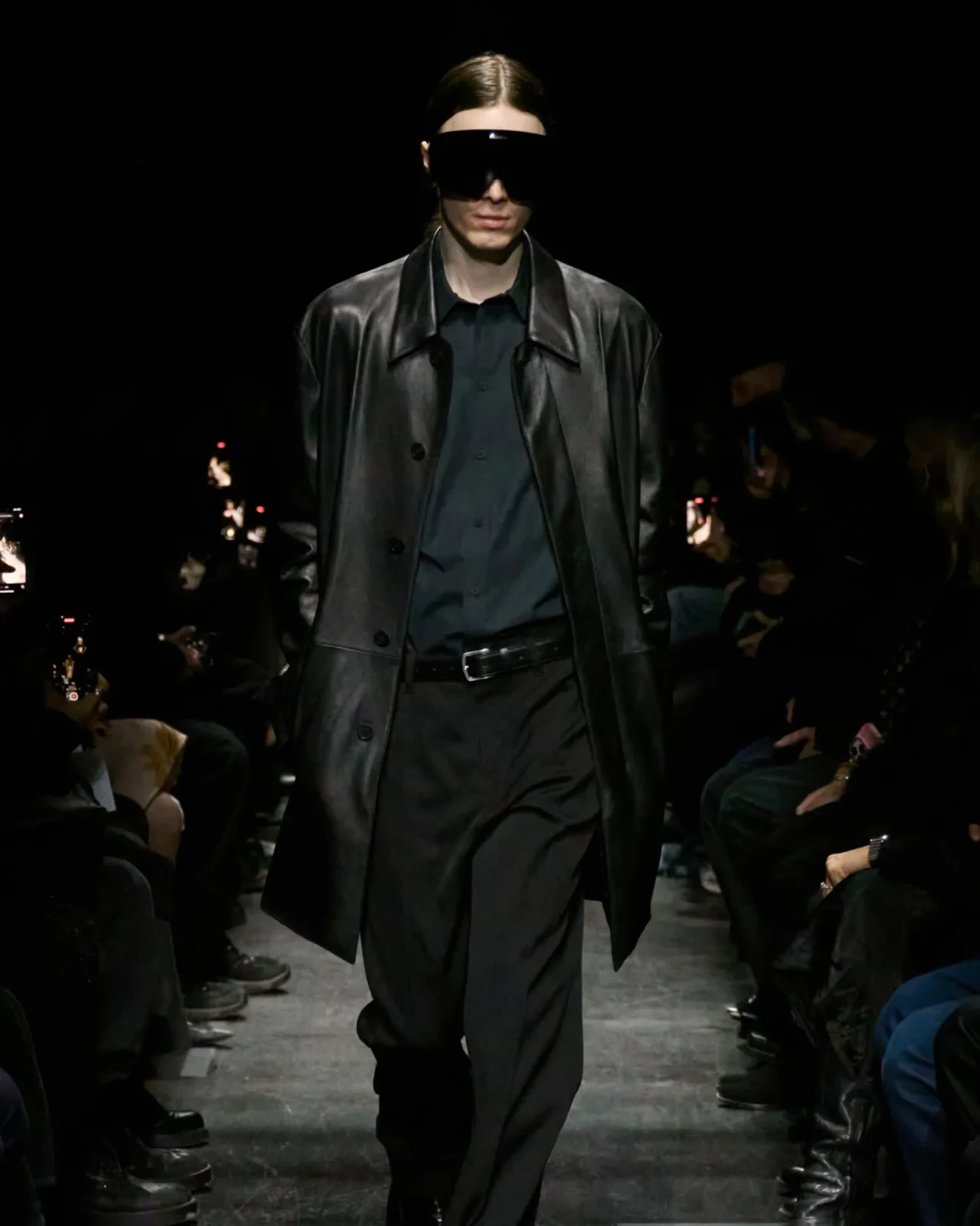 At Dior, Kim Jones’ final collection featured models with eyes covered by fabric rather than sunglasses, a gesture that suggested both anonymity and defiance. Saint Laurent presented long leather coats and tailored black ensembles that recalled the film’s most iconic imagery. Balenciaga and Enfants Riches Déprimés also embraced this aesthetic, presenting leather-heavy looks that felt straight out of the film.