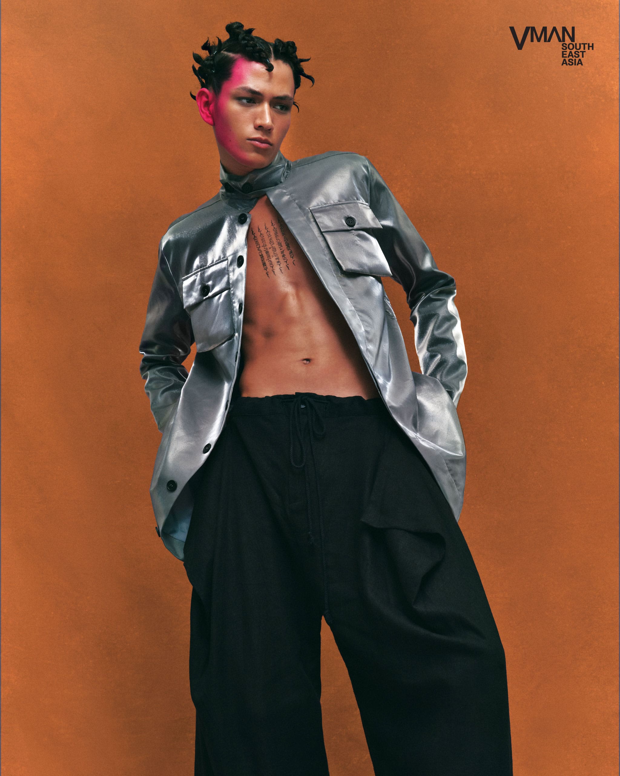 Perpaduan khas Don yang memadukan unsur edgy dan mewah, seperti yang terlihat pada jaket perak metalik yang dipasangkan dengan celana panjang hitam yang melambai, menampilkan kegemarannya akan pakaian pria modern. Desainer asal Filipina ini, yang membuat gebrakan di kancah mode Kamboja, terus mendobrak batasan, satu demi satu pakaian yang berani.
