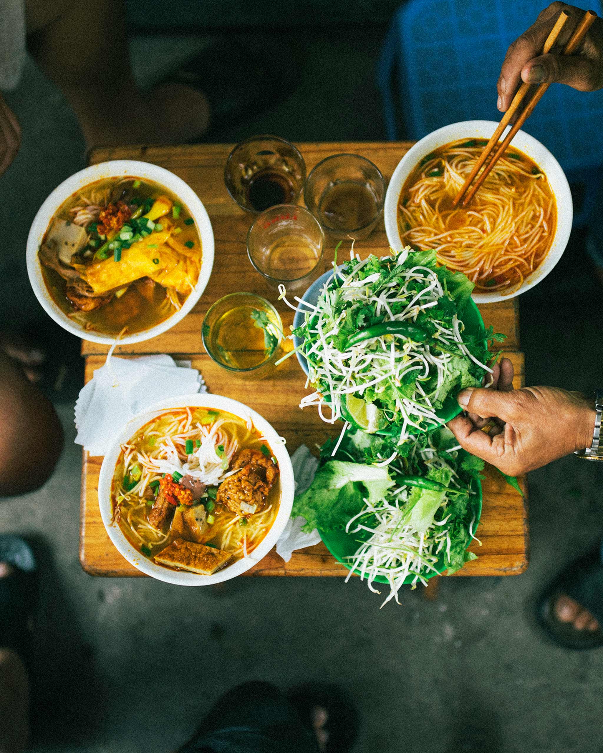 นับตั้งแต่ร้าน pho ที่พลุกพล่านไปด้วยผู้คนในยามเช้า เช่น Pho Le ที่เสิร์ฟก๋วยเตี๋ยวน้ำข้นอันเป็นเอกลักษณ์ของเวียดนามให้กับลูกค้าที่รอคอย ไปจนถึงร้านอาหารมื้อค่ำที่หรูหรา แต่ละร้านต่างก็มีส่วนสนับสนุนเรื่องราวที่ยิ่งใหญ่กว่านั้น