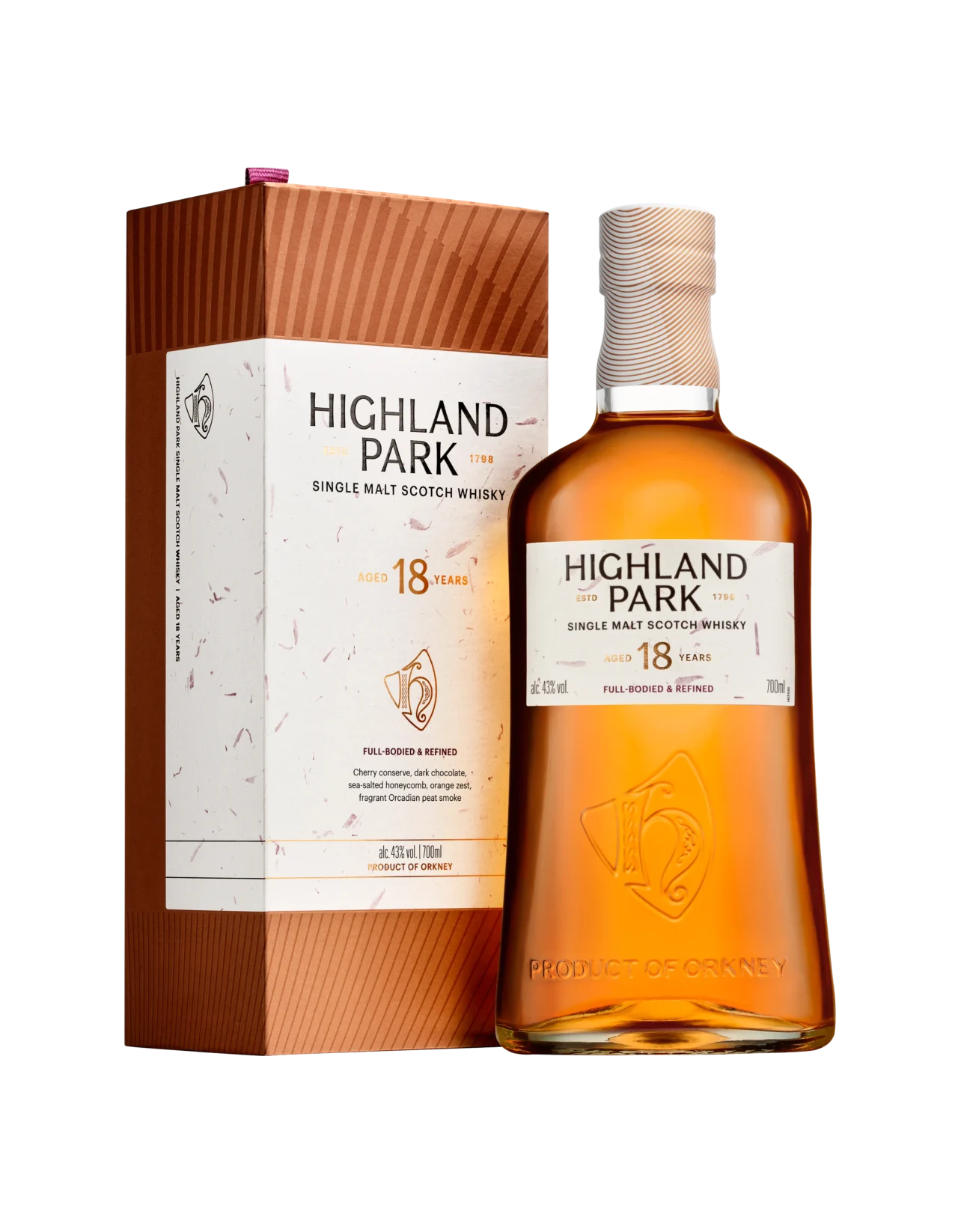 This undeniable connection to the land is the pulse of Highland Park, a whisky shaped by the dramatic coastlines and ethereal light of its Orkney home. That connection to the environment is now visually captured in the 12-, 15-, and 18-year-old Single Malt Scotch whiskies, with a clean visual.